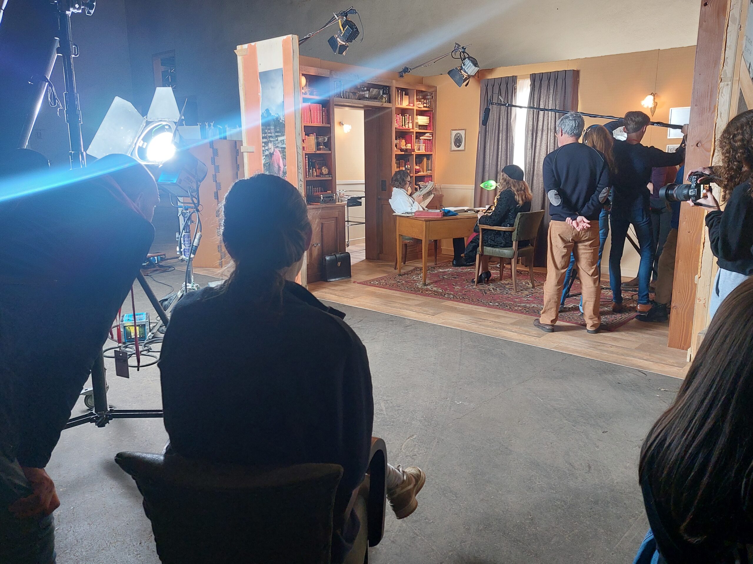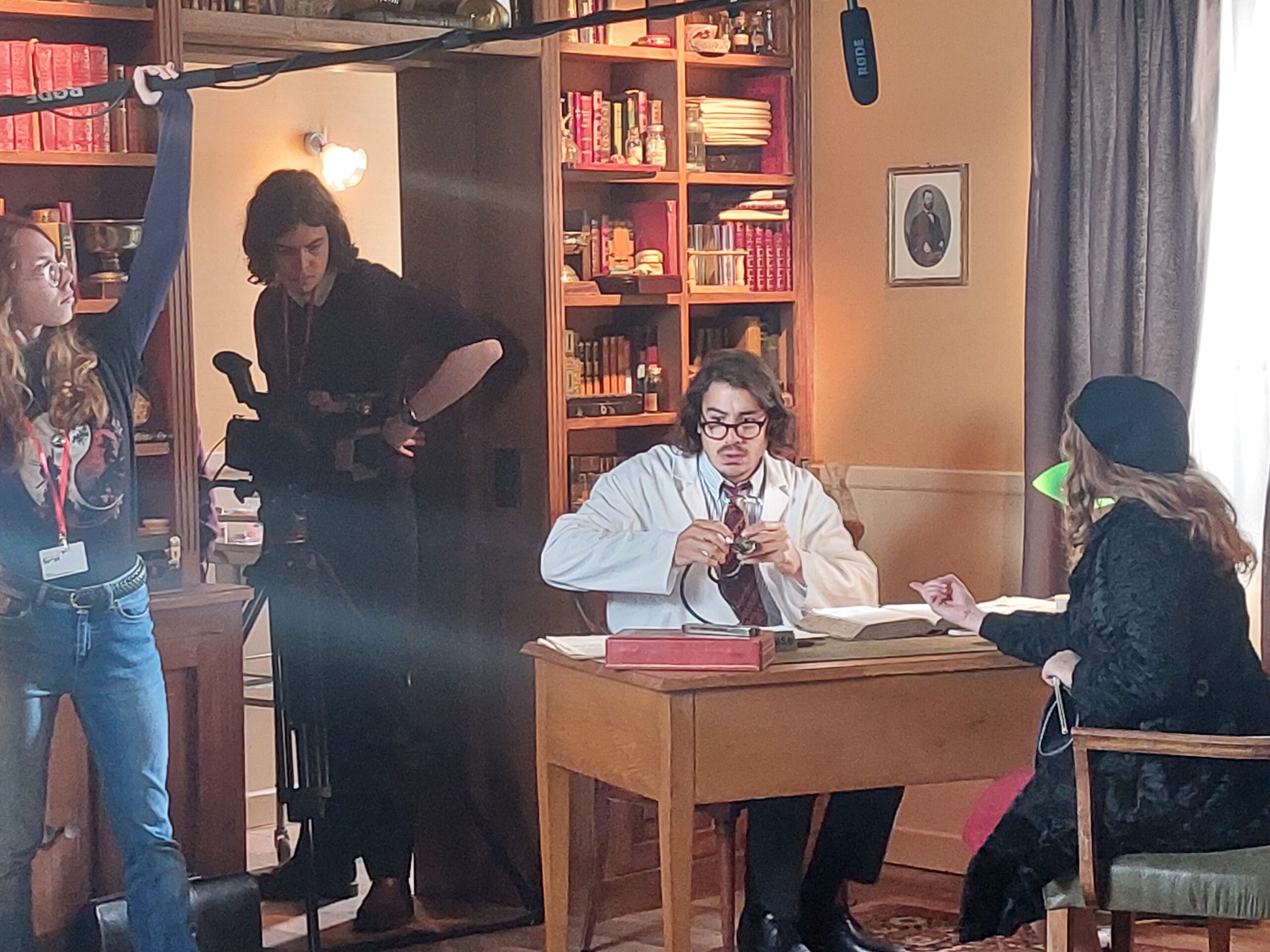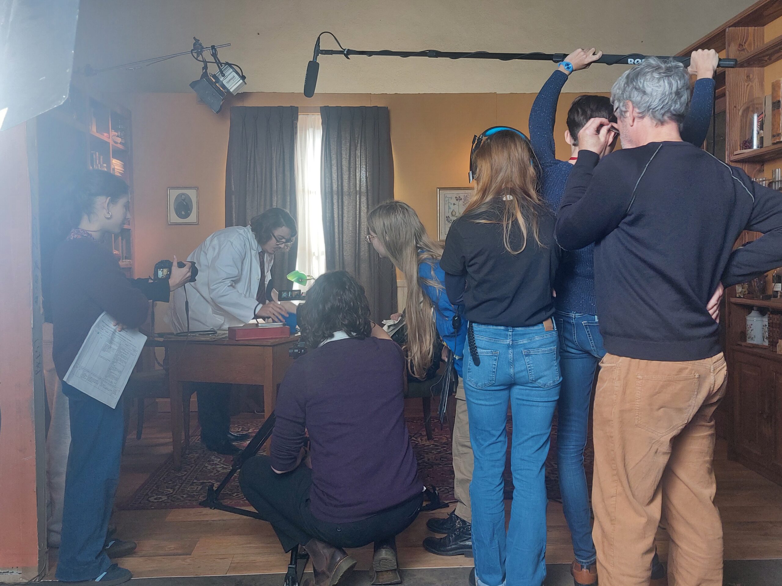 L’avant-veille du tournage, nous visitons les studios France Tabac et découvrons enfin le décor du Cabinet médical dans lequel nous allons tourner, conçu et réalisé par les lycées professionnels de Sarlat pour la menuiserie et ceux de Bordeaux pour l’ameublement et les accessoires. C’est l’occasion pour nous de tester et modifier certains plans et d’échanger avec le reste de l’équipe artistique : le réalisateur Frédéric Chignac ainsi que l’actrice Anne Duverneuil et le comédien Florian Choquart, habillés, maquillés et coiffés par le lycée professionnel d’Agen. Chaque membre trouve sa place : Zoé dirigera les acteurs sur le plateau, Adèle assurera la cohérence des scènes comme assistante réalisatrice et scripte, Jade et Aubin se relaieront à la perche, se chargeant aussi de placer au bon endroit le pied de caméra sans perturber l’installation-lumières de Diarra Sourang, cheffe électricienne professionnelle dont le métier a été exploré en amont grâce à un podcast inspirant.