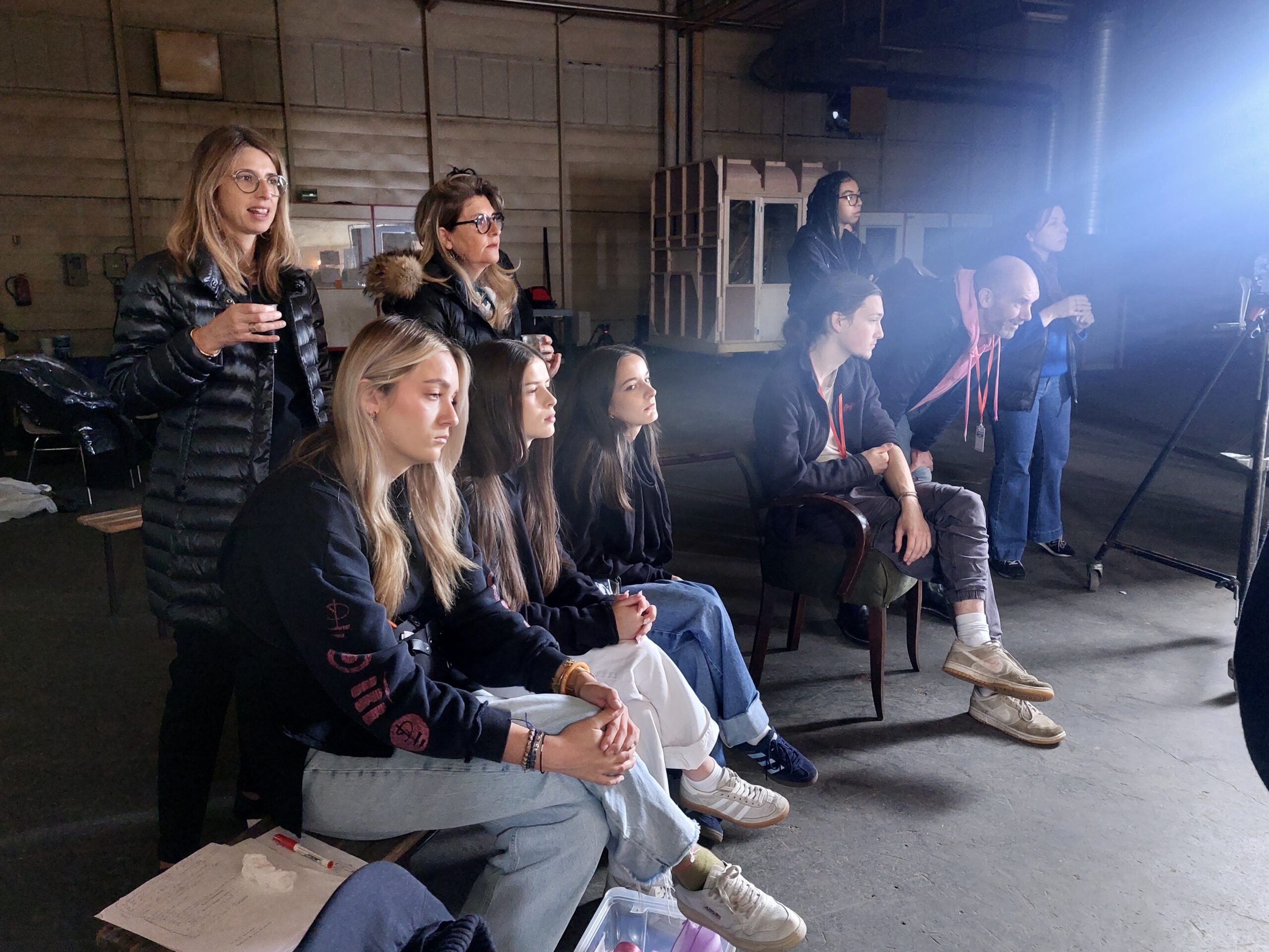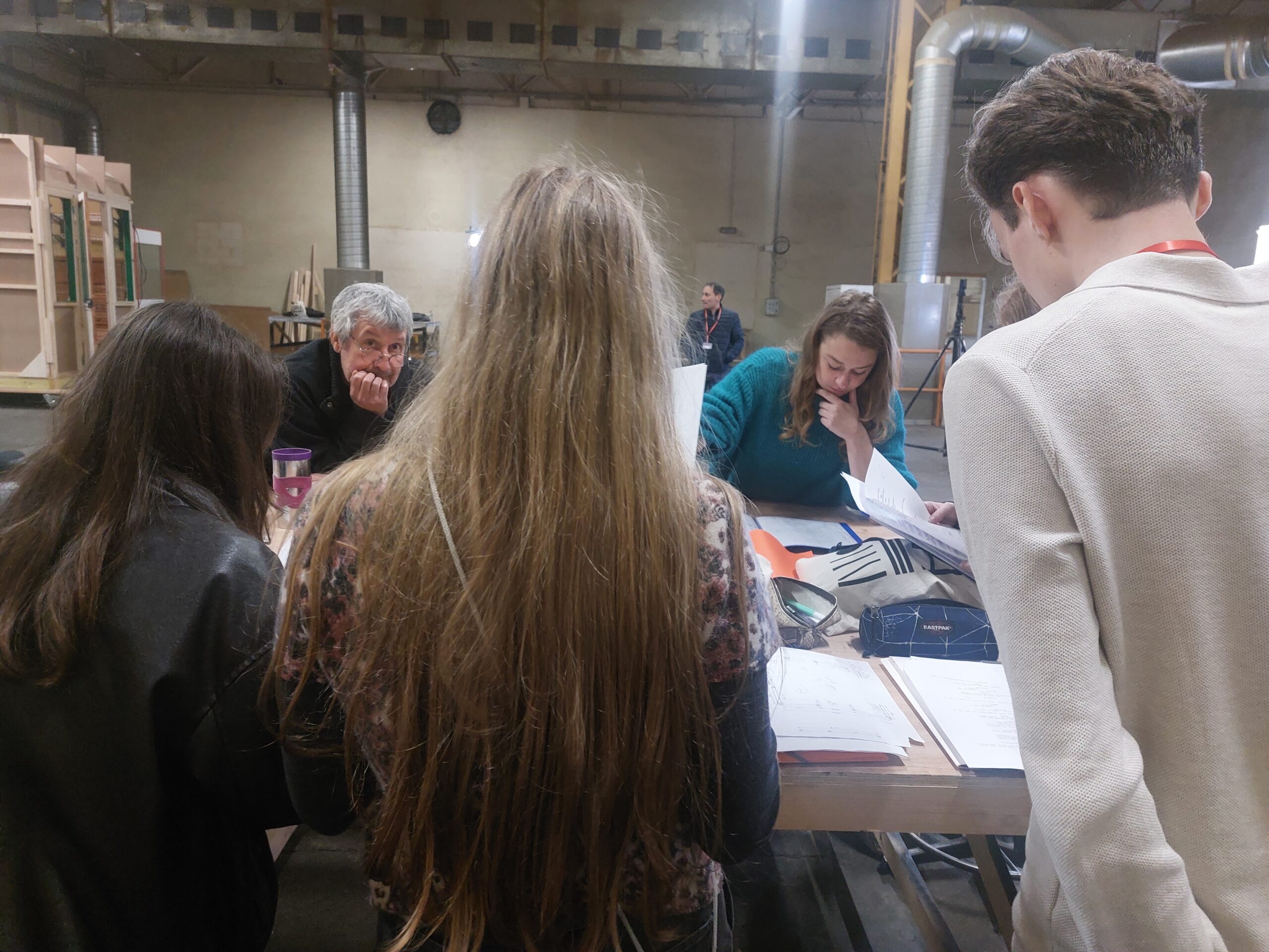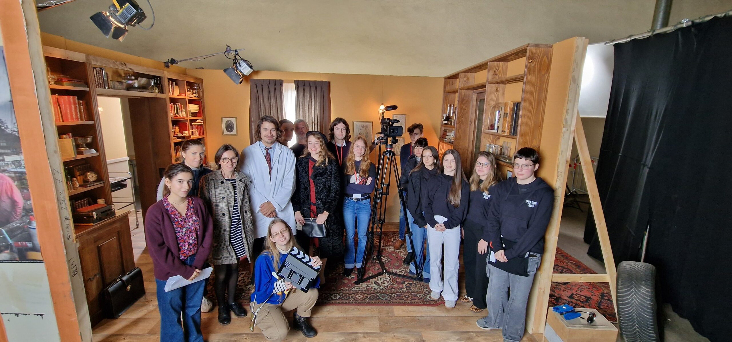 L’avant-veille du tournage, nous visitons les studios France Tabac et découvrons enfin le décor du Cabinet médical dans lequel nous allons tourner, conçu et réalisé par les lycées professionnels de Sarlat pour la menuiserie et ceux de Bordeaux pour l’ameublement et les accessoires. C’est l’occasion pour nous de tester et modifier certains plans et d’échanger avec le reste de l’équipe artistique : le réalisateur Frédéric Chignac ainsi que l’actrice Anne Duverneuil et le comédien Florian Choquart, habillés, maquillés et coiffés par le lycée professionnel d’Agen. Chaque membre trouve sa place : Zoé dirigera les acteurs sur le plateau, Adèle assurera la cohérence des scènes comme assistante réalisatrice et scripte, Jade et Aubin se relaieront à la perche, se chargeant aussi de placer au bon endroit le pied de caméra sans perturber l’installation-lumières de Diarra Sourang, cheffe électricienne professionnelle dont le métier a été exploré en amont grâce à un podcast inspirant.